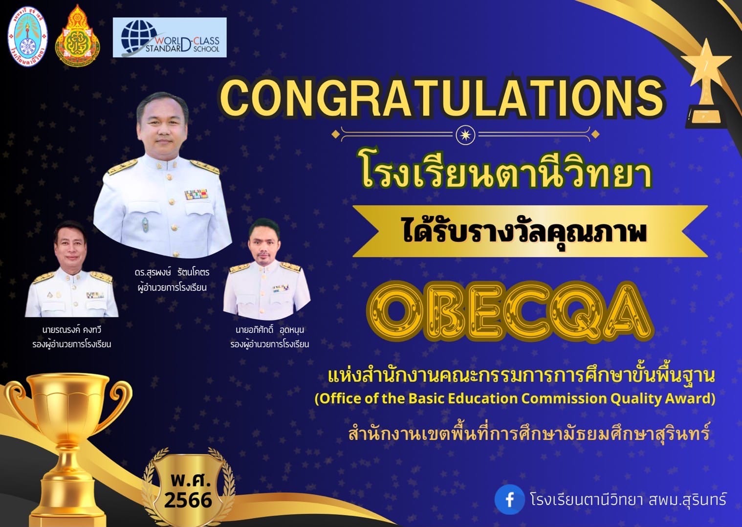 โรงเรียนได้รับรางวัลคุณภาพแห่งสำนักงานคณะกรรมการการศึกษาขั้นพื้นฐาน (Office of The Basic Education Commission Quality Award : OBECQA) โรงเรียนมาตรฐานสากล (World-Class Standard School) ระดับ OBECQA ประ