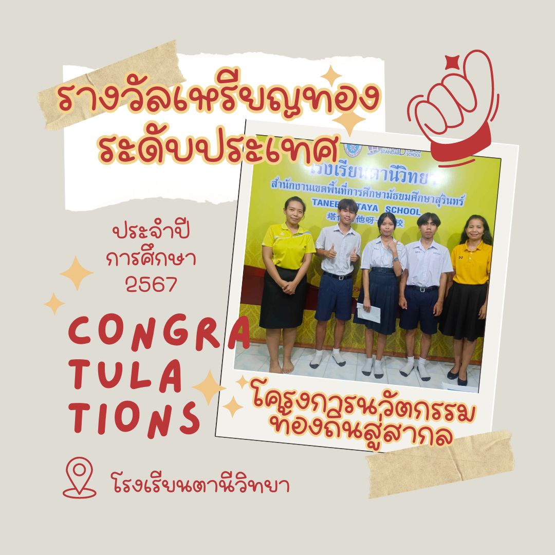 นักเรียนได้รับรางวัลเหรัยญทองระดับประเทศ การประกวดโครงการนวัตกรรมท้องถิ่นสู่สากล