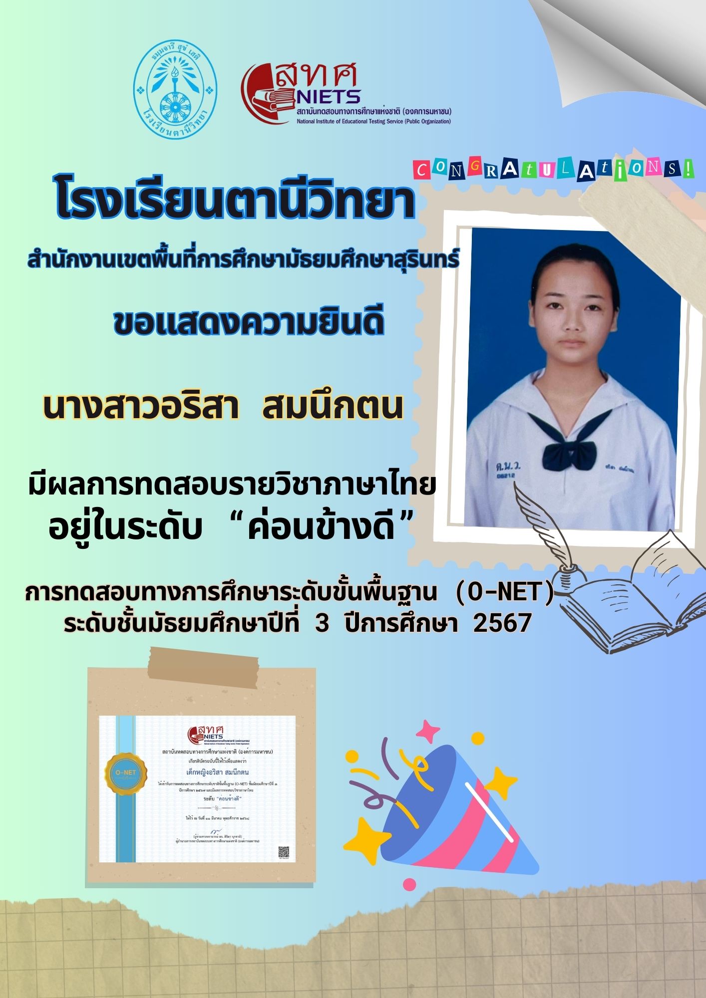 ขอแสดงความยินดีกับนักเรียนที่เข้าร่วมทดสอบทางการศึกษาขั้นพื้นฐานระดับชาติ(O-NET) ปีการศึกษา 2567